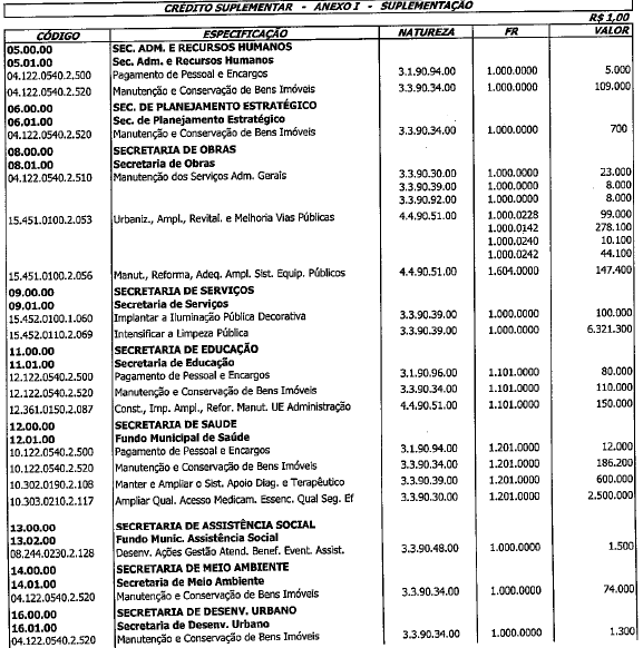 No Decreto n° 1.580/2017 de 14 de agosto de 2017, publicado no DOM/ES do dia 15 de agosto de 2017, no Crédito Suplementar – Anexo I – Anulação