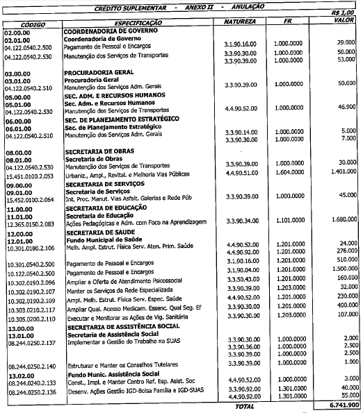 Art. 2° Para efeito das suplementações constante no Artigo anterior, ficam anuladas as dotações orçamentárias, indicada no anexo II.