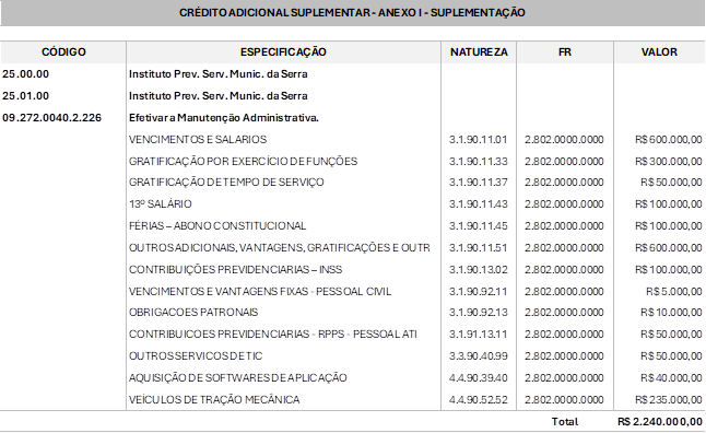 O PREFEITO MUNICIPAL DA SERRA, ESPÍRITO SANTO, usando de suas atribuições legais, e com base no artigo 12º da Lei nº 6.124, de 27 de dezembro de 2024 (Lei Orçamentária Anual de 2025); fica autorizado abrir créditos adicionais suplementares excluídos do limite previsto no art. 11: I - os provenientes de superávit financeiro apurado em balanço patrimonial do exercício anterior no termo do inciso I do § 1º do artigo 43 da Lei Federal n°. 4320 de 17 de março de 1964; II - os provenientes de excesso de arrecadação nos termos dos incisos II dos § 1º e § 3º do artigo 43 da Lei Federal n°. 4320 de 17 de março de 1964; III - os destinados a suprir insuficiências nas dotações de pessoal e encargos; IV - os provenientes da anulação de dotações consignadas no mesmo programa. Decreta:
