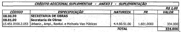 Art. 1° Fica Aberto o Crédito Adicional Suplementar no valor de R$ 334.000,00 (trezentos e trinta e quatro mil reais) no orçamento vigente na dotação orçamentária constante do Anexo I.