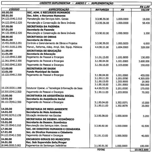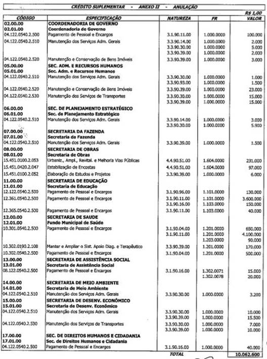 Art. 2° Para efeito das suplementações constante no Artigo anterior, ficam anuladas as dotações orçamentárias, indicada no anexo II.