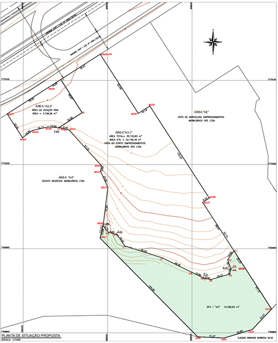 I - Área “A3.1” desmembrada, medindo 35.132,83 m² (trinta e cinco mil, cento e trinta e dois metros quadrados e oitenta e três decímetros quadrados), sendo que 24.736,18m² (vinte e quatro mil, setecentos e trinta e seis metros quadrados e dezoito decímetros quadrados) é considerada área passível de parcelamento;