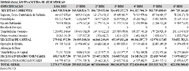 Art. 1º Fica estabelecida a programação financeira e o cronograma de execução mensal de desembolso, bem como as metas bimestrais de arrecadação das receitas totais e as medidas de combate à evasão e à sonegação para o exercício financeiro de 2023, conforme discriminação constante dos Anexos deste Decreto.