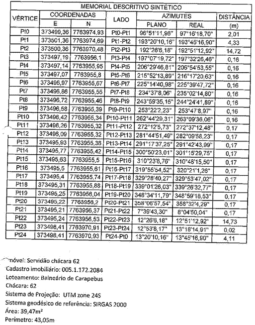 a) a Área medindo 39,47m² (anexo 1), integrante da Chácara 62 que está localizada na Rua Acácia, com área total de 6.470m², no Loteamento “Balneário Carapebus”, Bairro Balneário de Carapebus, Distrito de Carapina, Serra – ES; de propriedade de Franco Bortoluzzi, com CPF nº 035.845.267-87; matriculada no Cartório de Registro de Registro Geral de Imóveis do 1º Ofício 2ª Zona da Serra, sob nº 1.754, Livro 2, conforme Anexo 1.