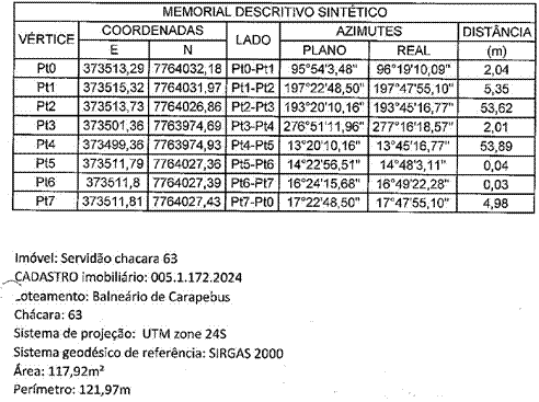 b) a Área medindo 117,92m² (anexo 1), integrante da Chácara 63 que está localizada na Rua Acácia, com área total de 6.338,00m², Loteamento “Balneário Carapebus”, Bairro Balneário de Carapebus, Distrito de Carapina, Serra – ES; de propriedade da sociedade Empresária Lazer Administração e Participação Ltda, inscrita no CNPJ nº 01.243.869/0001-20; matriculada no Cartório de Registro de Registro Geral de Imóveis do 1º Ofício 2ª Zona da Serra, sob nº 16.592, Livro 2.