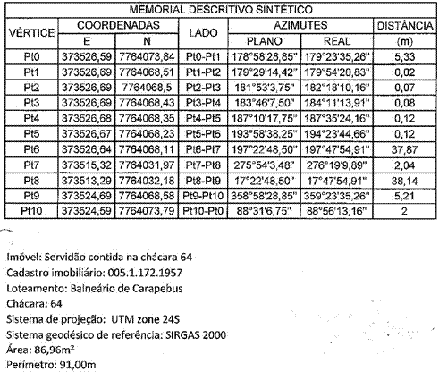 c) a Área medindo 86,96m² (anexo 1), integrante da Chácara 64 que está localizada na Rua Acácia, com área total de 7.322,00 m², Loteamento “Balneário Carapebus”, Bairro Balneário de Carapebus, Distrito de Carapina, Serra – ES; de propriedade de Franco Bortoluzzi com CPF nº 035.845.267-87; matriculada no Cartório de Registro Geral de Imóveis do 1º Ofício 2ª Zona da Serra, sob nº 3.594, Livro 2, conforme Anexo 1.