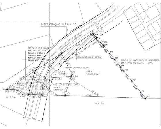 I - a “ÁREA 1”, medindo 10.070,13m² (dez mil e setenta metros quadrados, e treze decímetros quadrados), confrontando-se pela frente com a Rodovia Norte Sul em um segmento de 67,90m; pelos fundos com “VALE S.A.” em um segmento de 145,53m; pelo lado direito com “Fundo de Investimentos Imobiliário em Ativos de Saúde - SAUD” em doze segmentos de 2,93m + 7,57m + 12,53m + 6,42m + 0,53m + 18,28m + 14,02m + 17,50m + 9,99m + 23,25m + 25,66m + 13,50m, totalizando 152,18m; e pelo lado esquerdo com a “ÁREA 2” e a “ÁREA 3” em três segmentos de 41,94m + 4,44m + 36,29m, totalizando 82,67m;