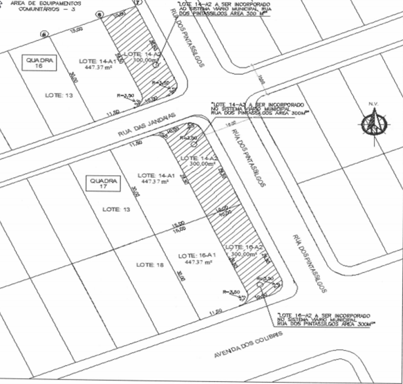 300,00m², confrontando-se de frente com a Rua das Jandaias, em 2 segmentos de 10,00 + 5,50, totalizando 15,50m; fundos com equipamento comunitário, em 1 segmento de