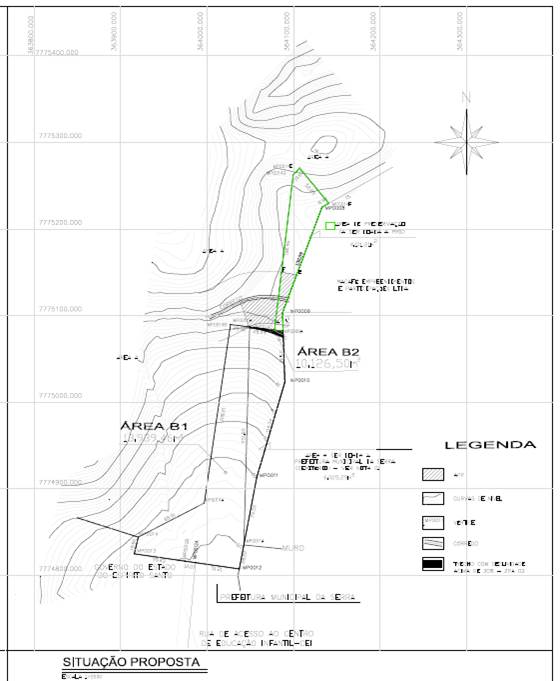 I - Área “B1”, desmembrada e medindo 13.939,46m², confrontando-se de frente com a rua de acesso ao Centro de Educação Infantil, em três segmentos de 51,21 + 12,07m + 59,43m = 122,71m; fundos com Área “A”, em um segmento de 22,32m; lado direito com Área “A”, em três segmentos de 251,85m + 28,99m + 180,46m = 314,02m e lado esquerdo com Área “B2” e Prefeitura Municipal da Serra, em dois segmentos de 28,20m + 251,85m = 280,05m.